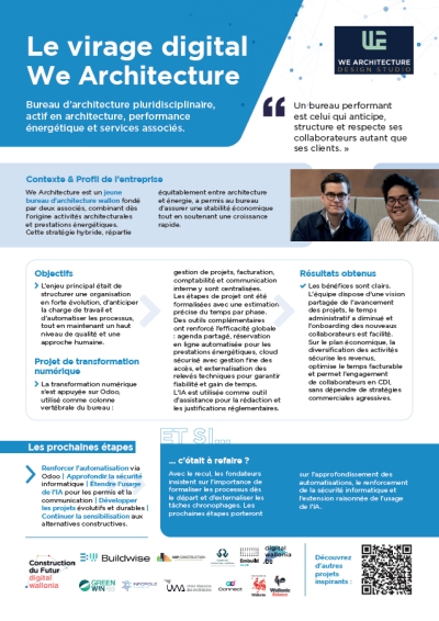 Partenaires du projet Construction du Futur : Buildwise, Union Wallonne des Architectes, Embuild Wallonie, Centre de Recherches Routières, CAP Construction, Infopole et GreenWin